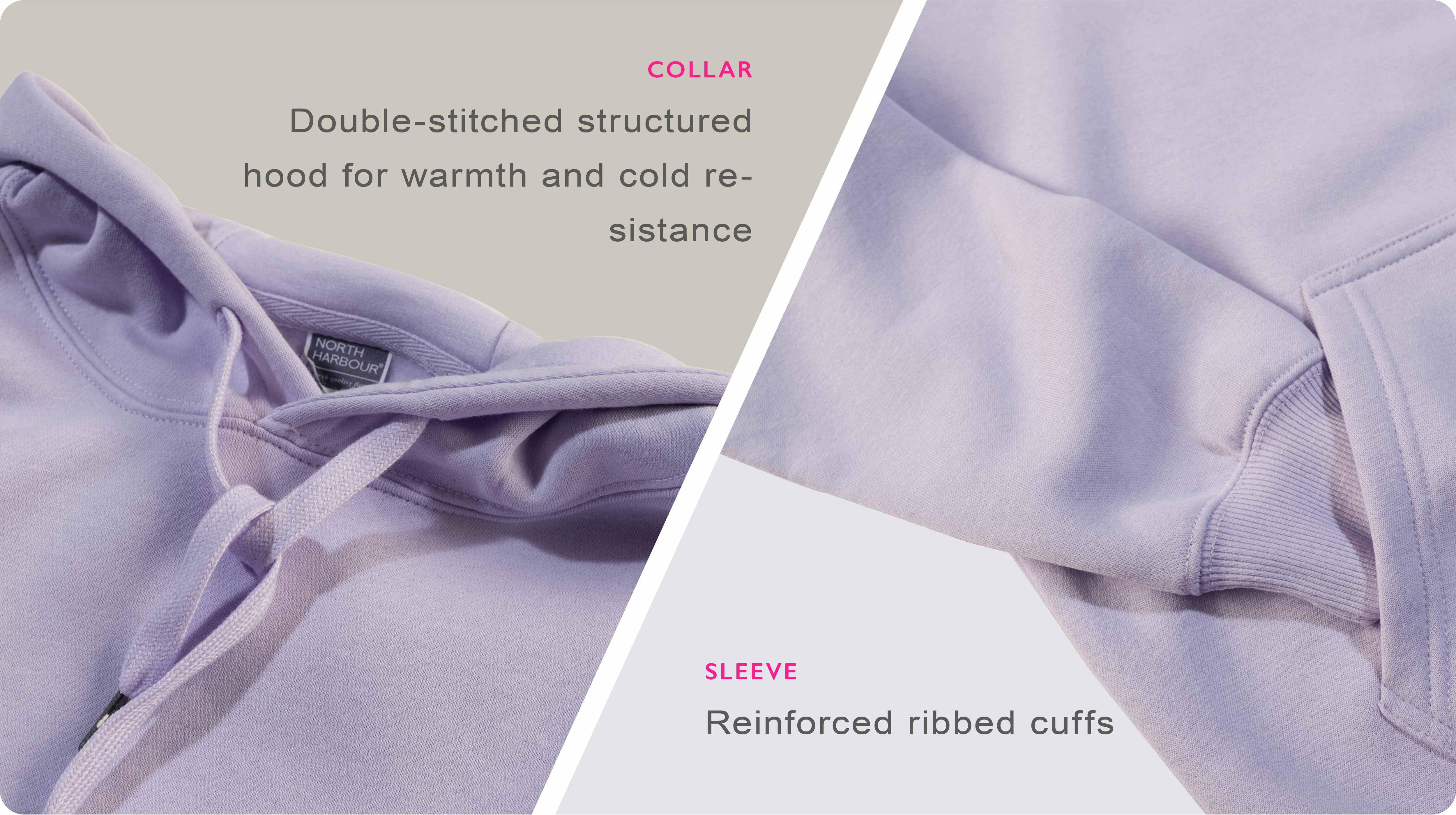 Front pouch pocket, structured hood, CVC elastic reinforced ribbed cuffs for warmth and cold resistance, certified and tested.